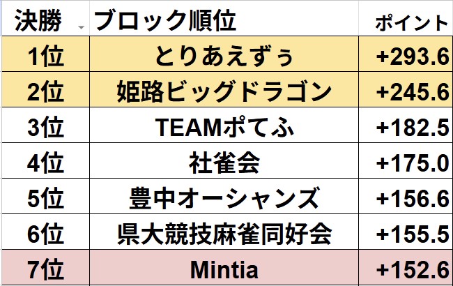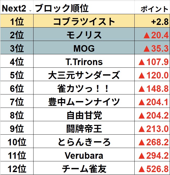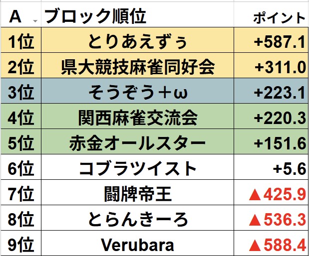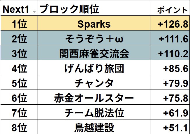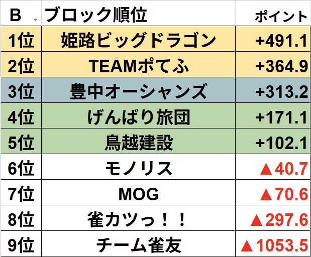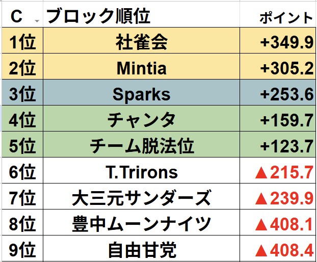 上記の結果を受け、ブロック分けと持越ポイントが以下となっております